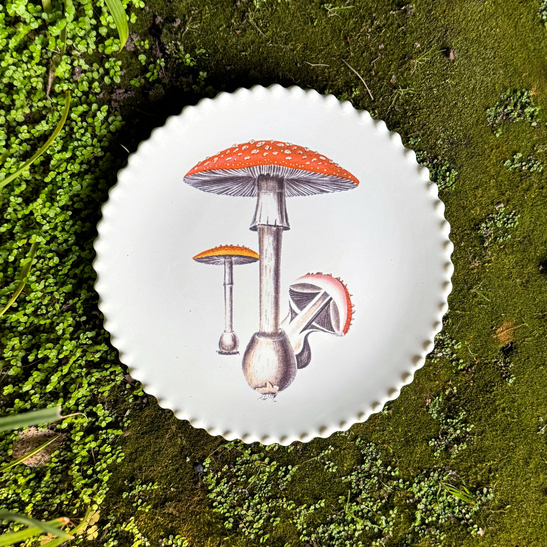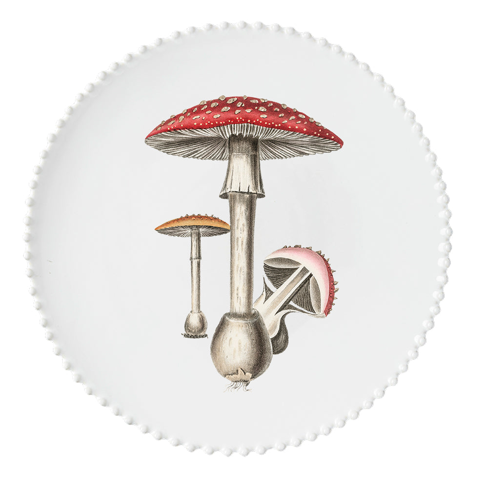 Plato de cerámica blanca y borde de perlitas, estampado con antiguos dibujos de Hongos silvestres.